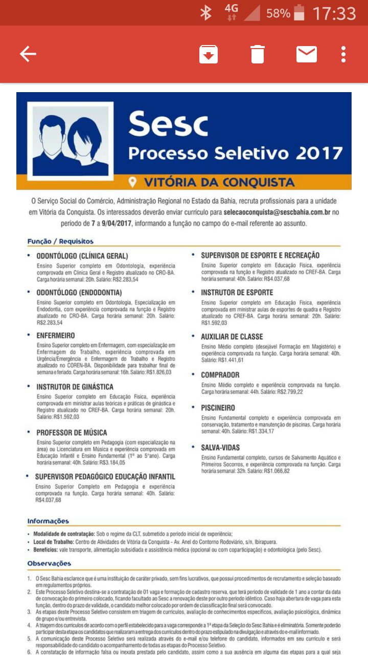 Conquista: SESC oferece diversas vagas de emprego; confira Por Rodrigo Ferraz postado em 8 de abril de 2017 às 8:54 O Serviço Social do Comércio (SESC), unidade de Vitória da Conquista, está oferecendo diversas vagas de emprego na capital do Sudoeste baiano. Confira as vagas e como participar do processo seletivo: