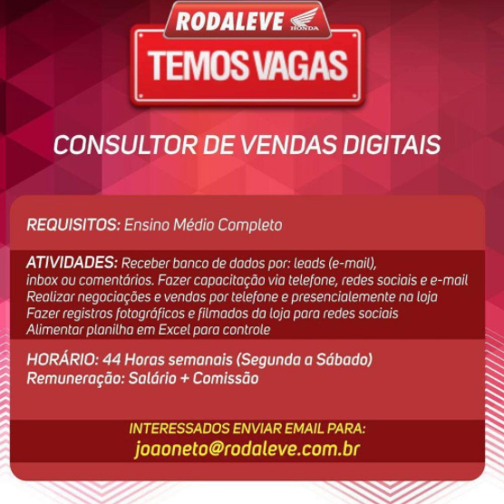 A Rodaleve Motos, concessionária Honda em Vitória da Conquista, está oferecendo vagas de emprego para consultor de peças .