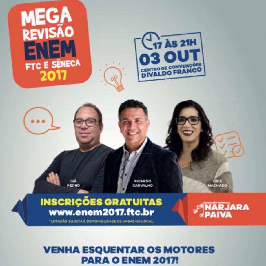 Consciente da importância desta prova para os estudantes, a Faculdade de Tecnologia e Ciências (FTC) realiza a Mega Revisão com conteúdos exclusivos e os melhores professores de todas as disciplinas dos principais pré-vestibulares e escolas de Ensino Médio da regiãoAs inscrições são gratuitas e podem ser feitas até o dia do evento pelo hotsite enem2017.ftc.br.