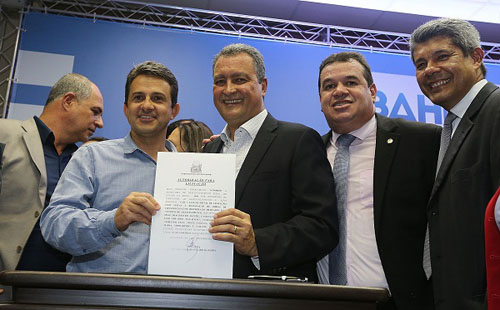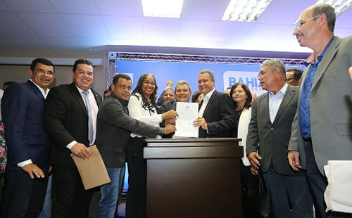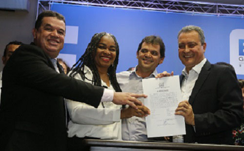 Ontem (13/11/17), o deputado Marquinho Viana e os prefeitos de Livramento de Nossa Senhora, Ricardinho, de Ibicoara, Haroldo, de Rio de Contas, Cristiano, de Planalto, Dico, e de Contendas do Sincorá, Didi, participaram do ato de assinatura de convênios, autorizados pelo governador Rui Costa, que determina a pavimentação do Bairro Belo Horizonte (SEDUR/CONDER), em Livramento de Nossa Senhora; autoriza a assistência técnica à Agricultura Familiar – BAHIATER (SDR/CAR), nos municípios de Ibicoara, Rio de Contas e Livramento de Nossa Senhora; a pavimentação da Avenida Teopompo (SEDUR/CONDER), em Ibicoara; construção do estádio de futebol (SUDESB), em Contendas do Sincorá; iluminação do estádio de futebol (SUDESB), em Planalto. O governador Rui Costa e o deputado Marquinho Viana foram bastante aplaudidos pela importância dos convênios assinados, que vão beneficiar as comunidades do interior baiano.