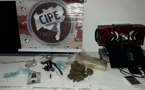 Com o apoio do coordenador de área foi feito o cerco e o individuo de nome Gil Max Lemos dos Santos, conhecido como” Diabo Louro “, 25 anos de idade foi detido, e realizando buscas na residencia foram encontrados mais 02 kg de substância prensada análoga a maconha, um revolver cal. .32, uma munição cal. .38, uma moto sem documentação, R$ 100,00 em espécie, alem de vários eletro eletrônicos provenientes da comercialização de drogas além de várias embalagens para acondicionamento de entorpecentes.