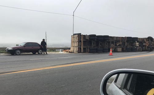 O condutor de uma carreta perdeu o controle do veículo e tombou. O trecho é conhecido por centenas de acidentes do mesmo tipo, principalmente quando o motorista não conhece a via.