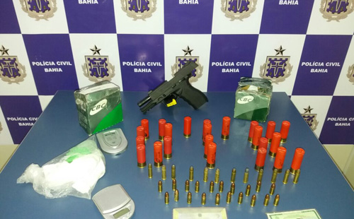 Os investigadores da Delegacia especializada, cumpriram um mandado de busca, representado pela DTE e expedido pela Justiça,  na casa dos acusados, localizada no Bairro Vila Serrana I,  onde encontraram e apreenderam uma arma de fogo, tipo pistola calibre 9 mm, de uso restrito,  municiada, e várias munições sobressalentes cal. 9mm,  cartuchos intactos calibre 38 e cal. 12 , usado em espingardas, além de uma barra grande partida de Cocaína prensada e uma balança de precisão usada no tráfico.
