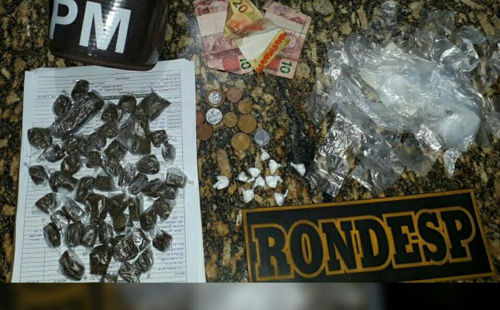 Em abordagem os militares encontraram cocaína com o indivíduo que confessou ter droga em sua residência. No local os militares encontrara grande quantidade de entorpecentes totalizando 10 trouxinhas de cocaína, 47 trouxas de maconha, 03 porções de maconha, 01 celular Alcatel, R$ 42,90 em espécie e diversas embalagens para acondicionamento de drogas.