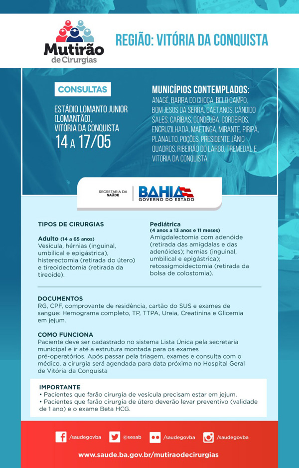 Em contato com a nossa reportagem, o secretário estadual de saúde, Fábio Vilas Boas, confirmou que a cidade de Vitória da Conquista irá receber o ‘mutirão de cirurgias’ do Governo do Estado, no período de 14 a 17 de maio.
