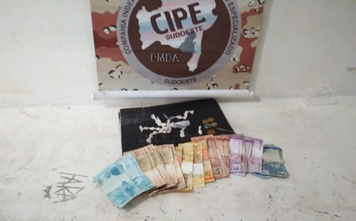 No último fim de semana, a CIPE/SUDOESTE (Caesg), em rondas pela cidade de VITÓRIA DA CONQUISTA, após denúncia anônima de tráfico de drogas, foi feita abordagem a um jovem em frente a sua residência no Bairro Brasil, durante buscas com o apoio do GRUPO DE OPERAÇÕES COM CÃES – GOC, foi encontrado 30 (trinta) pedras de uma substância semelhante a crack e a quantia em espécie de R$ 697,00 reais (seiscentos e noventa e sete reais).