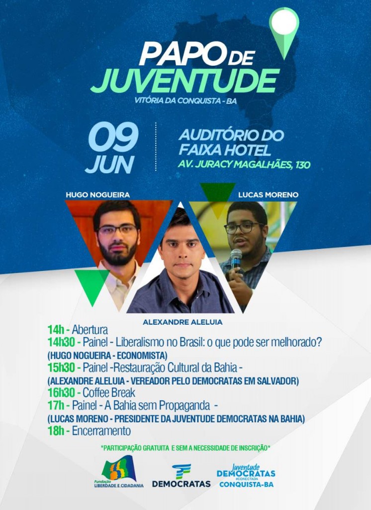 O jovem advogado Guilherme Brito, que comanda a juventude do DEM em Conquista, disse que o evento promete discutir temas relevantes, como a reestruturação cultural da Bahia, ‘A Bahia sem Propaganda’ e o ‘Liberalismo no Brasil’.