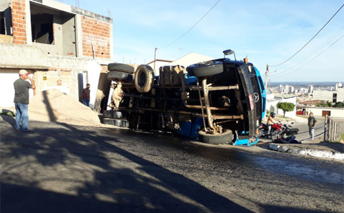 Um caminhão tombou no momento em que descarregava areia no Bairro Panorama, em Vitória da Conquista, na tarde desta sexta-feira (08). O fato aconteceu nas proximidades do campo de futebol da localidade.
