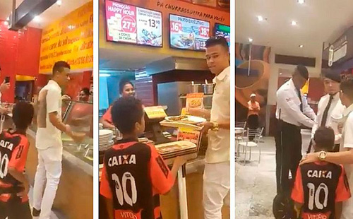 O vídeo de um segurança tentando impedir uma criança de comer o almoço comprado por um cliente ganhou repercussão nas redes sociais. Parte da situação foi gravada por uma pessoa que estava no local e, depois, postada no Facebook do próprio Kaique.