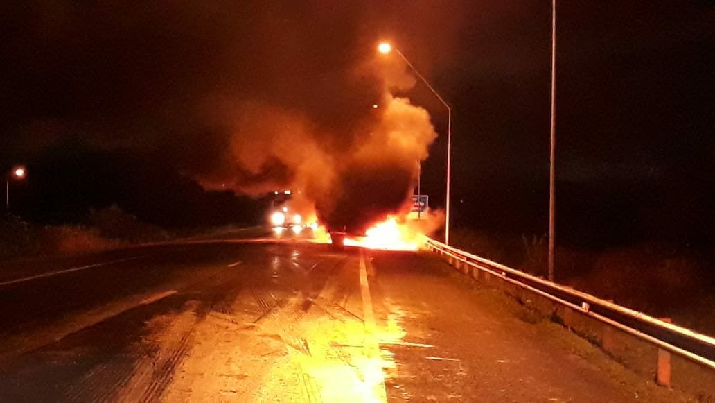 O caminhão incendiou-se após a colisão. A pista ficou interditada por duas horas.