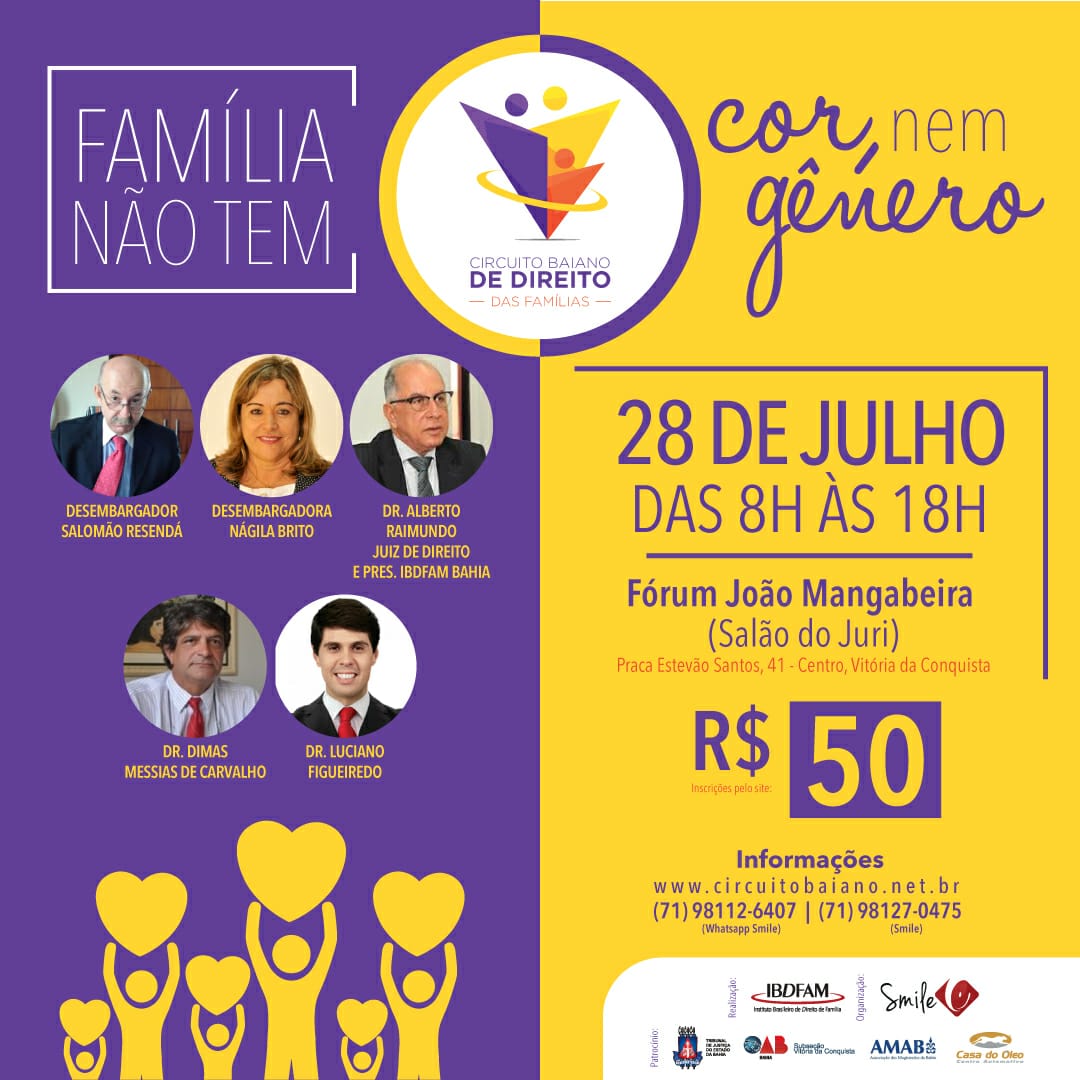 atinge também o centro da sociedade: a família. Com o intuito de suprir a escassez de informações da sociedade sem acesso ao profissional de Direito no interior do estado da Bahia, a diretoria regional da Bahia do Instituto Brasileiro de Direito das Famílias (IBDFAM) desenvolveu o projeto Circuito Baiano de Direito da Família e Sucessões, que terá a sua terceira edição sediada na cidade de Vitória da Conquista, no Fórum João Mangabeira (Salão do júri), no dia 28 de julho, das 08h às 18h.