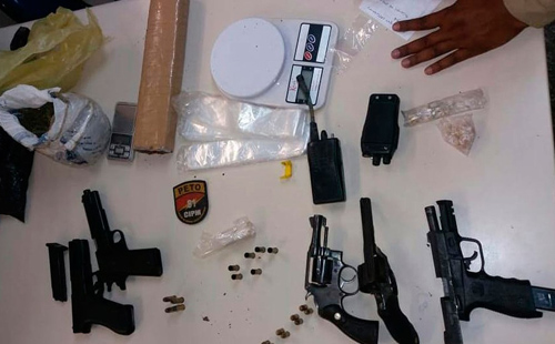 Com o grupo, os PMs apreenderam uma pistola, dois revólveres, dois simulacros de pistola, munições, um tablete de maconha e porções de crack.