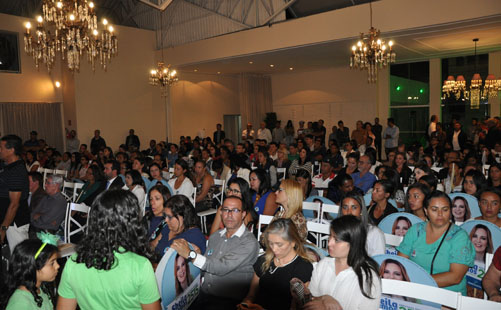 Ao lado do prefeito de Salvador, ACM Neto, que apoia a sua candidatura, Sheila discursou para uma plateia de apoiadores, a exemplo da sua mãe, a vice-prefeita de Conquista, Irma Lemos.