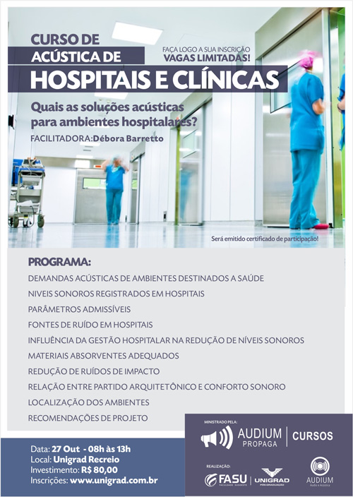 A Unigrad – FASU realiza em parceria com a AUDIUM – Áudio e Acústica o Curso Acústica de Hospitais e Clínicas, no dia 27 de outubro. O curso é voltado para Arquitetos, Engenheiros e estudantes do último semestre dessas áreas, e será facilitado pela arquiteta Débora Barretto, vice-presidente da Sociedade Brasileira de Acústica – SOBRAC.