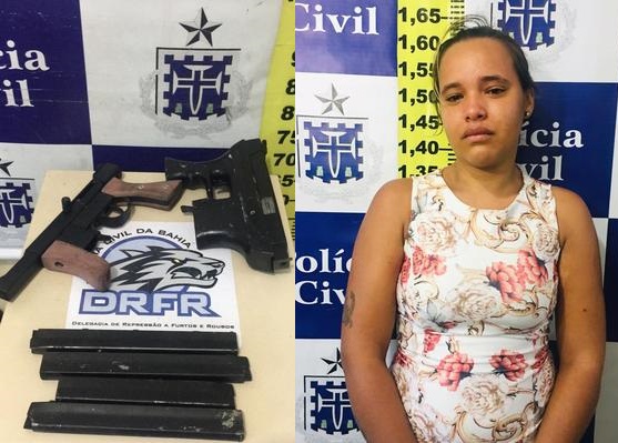 Flagrada com duas metralhadoras de fabricação artesanal e quatro carregadores, Taiane Santos França, a Tai, foi presa por policiais da Delegacia de Repressão a Furtos e Roubos (DRFR), de Feira de Santana, na terça-feira (11).