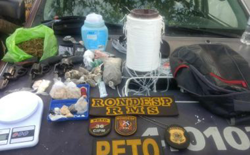 Três revólveres calibres 38, munições, porções de maconha, cocaína e crack, balança, embalagens plásticas, entre outros itens foram apreendidos. Guarnições seguem na região.