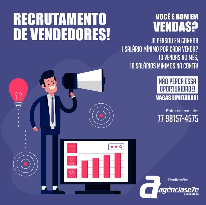 _A Agência Sete está recrutando vendedores para atuar em uma empresa de Vitória da Conquista._