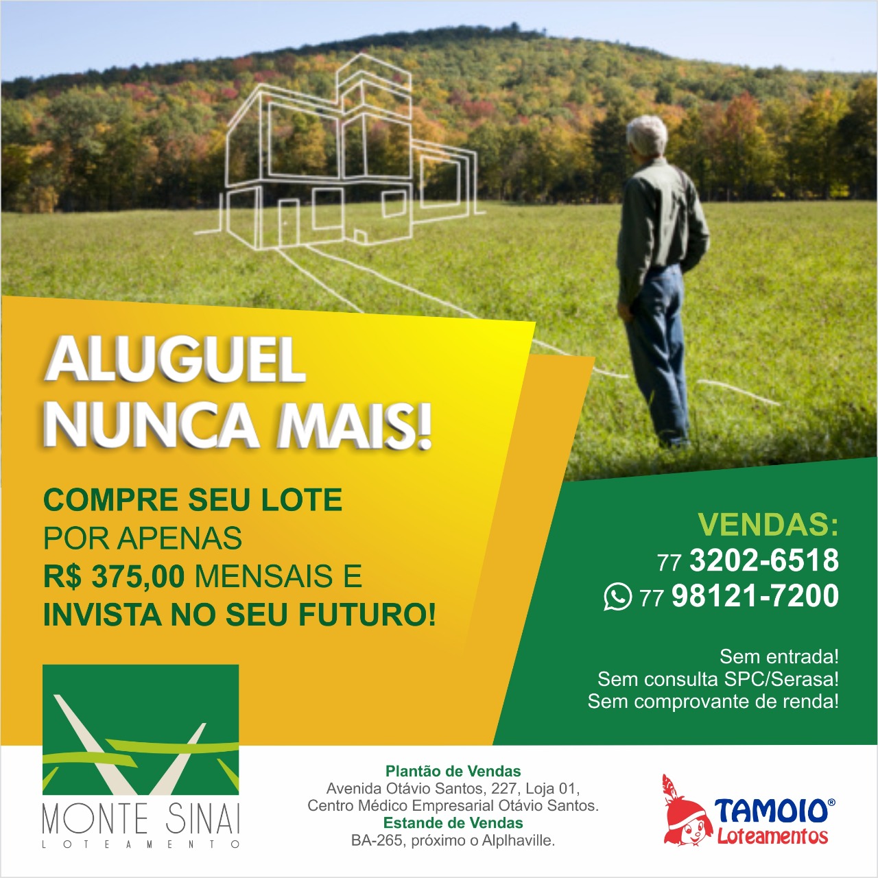 Que tal morar no que é seu? Compre seu lote no Monte Sinai Loteamento e invista no seu futuro! Crédito facilitado sem consulta ao SPC/Serasa e sem comprovação de renda. Planeje seu futuro e se livre do aluguel! O Monte Sinai oferece lotes de 360m² a partir de R$ 375,00 mensais, sem entrada!