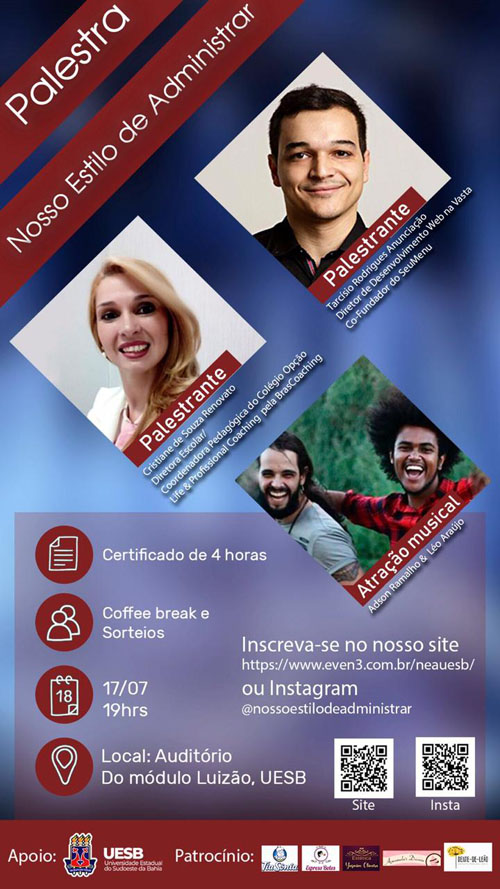 No dia 17 de Julho às 19h, no auditório do módulo Luizão, na Uesb, alunos do curso de Administração, sob a orientação do professor Raimundo Nova promoverão a palestra “ Nosso Estilo de Administrar”.