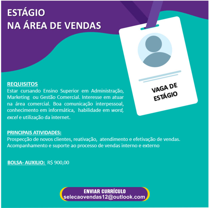 Conquista: Empresa oferece vagas de emprego e estágio para área de vendas; confira Por Rodrigo Ferraz postado em 19 de agosto de 2019 às 10:53 Uma empresa de Vitória da Conquista está oferecendo vagas de emprego e estágio para a área de vendas. Clique nos banners abaixo e confira todas as informações. Boa sorte!