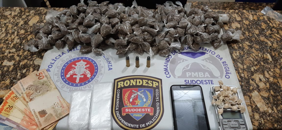 Por volta das 20h50 de ontem (19) a guarnição da Rondesp Sudoeste em rondas na Av. Salvador, em Conquista percebeu um homem em atitude suspeita que ao visualizar a viatura da Rondesp dispensou uma sacola contendo 5 trouxinhas de maconha e 4 pedras de crack, que o mesmo, ao ser interpelado sobre a origem da droga nos informou que traficava no local e que em sua casa estava guardado mais droga, momento, que a polícia se deslocou até o local indicado e foi encontrado mas 282 trouxinhas de maconha e 23 pedras de crack