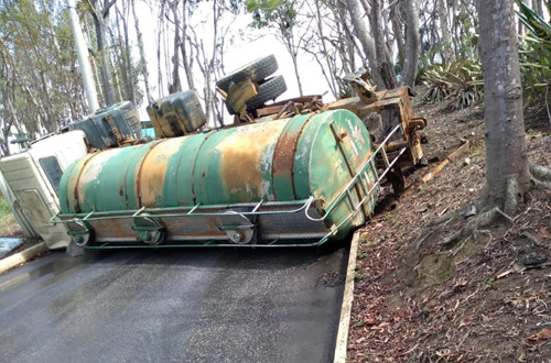 Um caminhão pipa que presta serviço a prefeitura tombou na ladeira que dá acesso ao equipamento esportivo.
