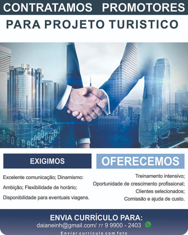 Vagas de emprego em Conquista: Empresa contrata promotores para projeto turístico; confira Por Rodrigo Ferraz postado em 13 de novembro de 2019 às 11:54 Clique no banner para ter mais informações: