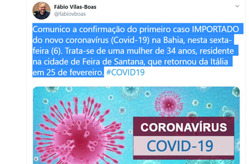 Comunico a confirmação do primeiro caso IMPORTADO do novo coronavírus (Covid-19) na Bahia, nesta sexta-feira (6). Trata-se de uma mulher de 34 anos, residente na cidade de Feira de Santana, que retornou da Itália em 25 de fevereiro.