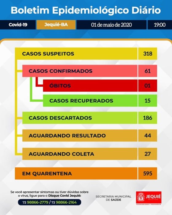 A pessoa que tiver dúvida sobre a doença ou apresentar os sintomas do coronavírus, devem acionar o Disque Covid Jequié, através dos telefones (73) 98866 2779 ou (73) 98866 2164.