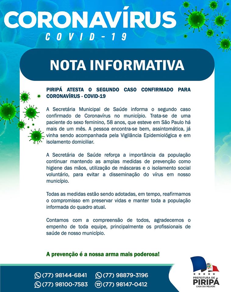 Próximo a Conquista: Piripá confirma mais um caso de coronavírus, é uma mulher Por Rodrigo Ferraz postado em 10 de maio de 2020 às 9:42