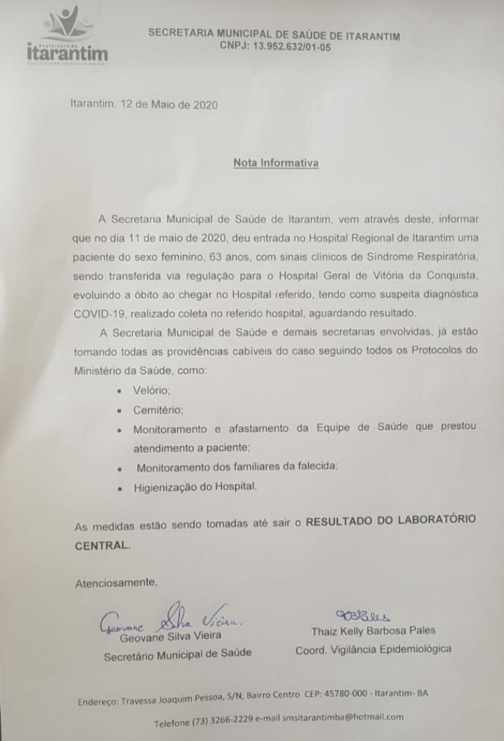 Os testes foram feitos e agora a secretaria aguarda o resultado. O nome dela não foi divulgado. Segundo a Prefeitura de Itarantim, todos os procedimentos de higienização foram feitos no hospital e a equipe de saúde que atendeu a paciente foi afastada para cumprir quarentena.