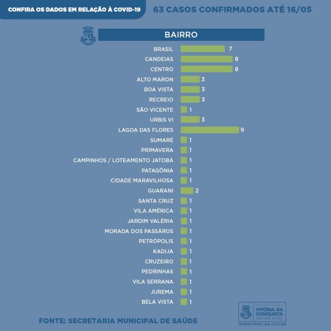 Os pacientes que foram infectados pela Covid-19 são residentes dos seguintes bairros do município: Centro (8), Recreio (3), Candeias (8), São Vicente (1), Brasil (7), Urbis VI (3), Alto Maron (3), Lagoa das Flores (9), Sumaré (1), Boa vista (3), Primavera (1), Campinhos/Loteamento Jatobá (1), Vila América (1), Patagônia (1), Guarani (2), Santa Cruz (1), Cidade maravilhosa (1), Morada dos Pássaros (1), Petrópolis (1), Kadija (1), Cruzeiro (1), Pedrinhas (1), Vila Serrana (1), Jurema (1) e Bela Vista (1).