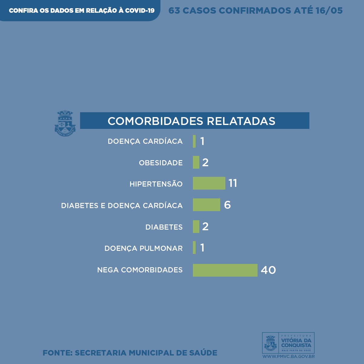 Dos 63 pacientes que testaram positivo para Coronavírus, 40 negaram ter alguma comorbidade. Os outros 23 possuem alguma comorbidade relacionada: Hipertensão (11), Diabetes e Doença Cardíaca (6), Diabetes (2), Doença Cardíaca (1), Obesidade (2) e Doença Pulmonar (1).