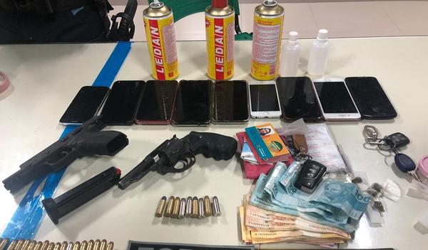 Os participantes tentaram fugir e esconder os materiais ilícitos mas acabaram sendo detidos. Com eles, foram apreendidos uma pistola calibre 380, um revólver calibre 38, sete papelotes de maconha, dois vidros de “loló” e três latas de respingo de solda. Os três presos foram autuados com base nos artigos 180 e 304 do Código Penal, no artigo 14 do Estatuto do Desarmamento e no artigo 244 do Estatuto da Criança e do Adolescente.