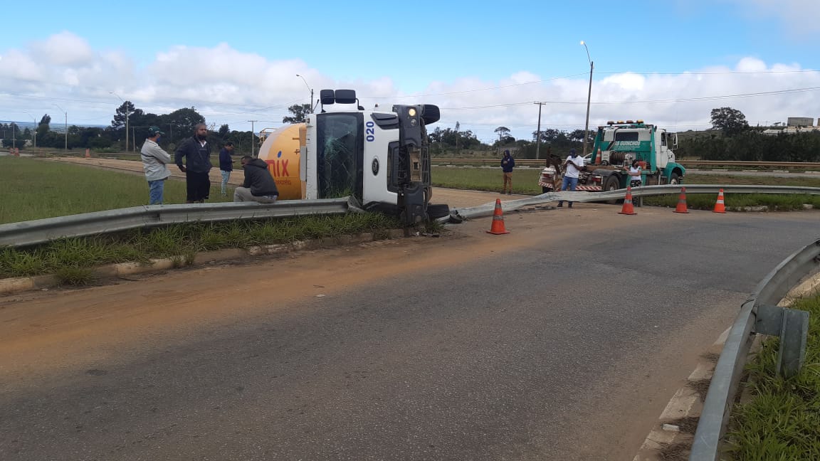 Um caminhão tombou na manhã desta quinta-feira (25) no anel rodoviário de Vitória da Conquista, trecho que liga para o município de Barra do Choça.