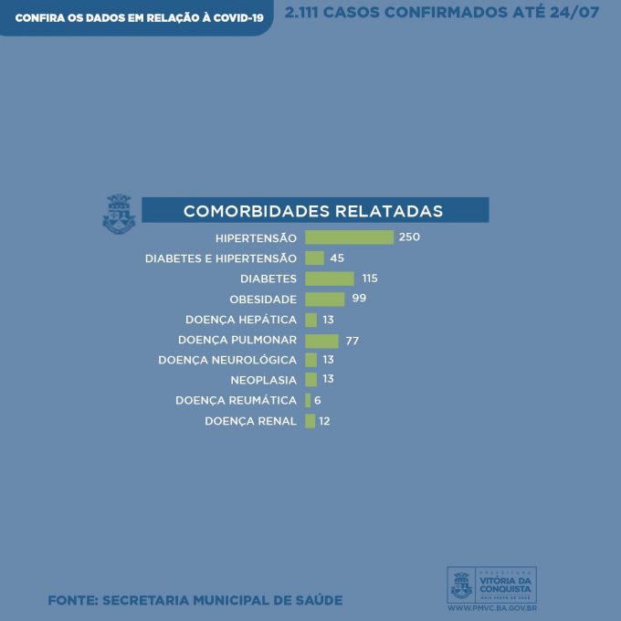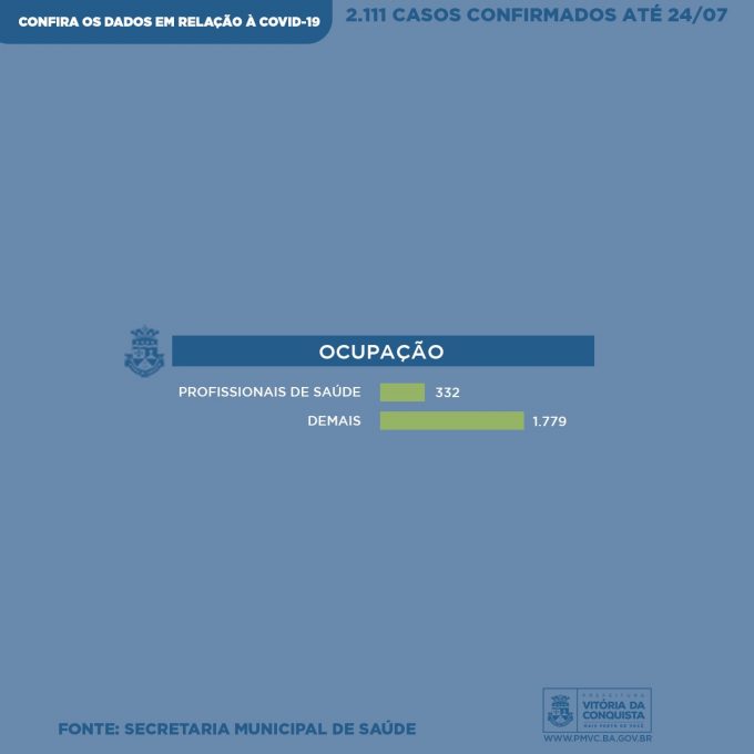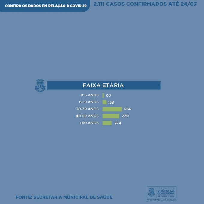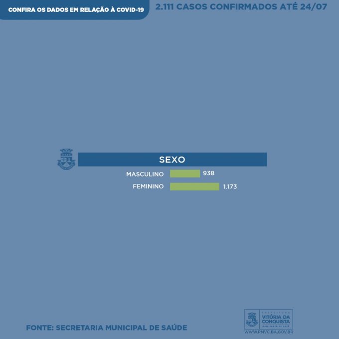 2.111 pessoas diagnosticadas com Covid-19 em Conquista, desde o dia 31 de março, quando foi confirmado o primeiro caso, até a última sexta-feira, 24 de julho. A Vigilância Epidemiológica divulgou o perfil semanal dos pacientes que testaram positivo para a doença, incluindo 587 casos confirmados nesta última semana.