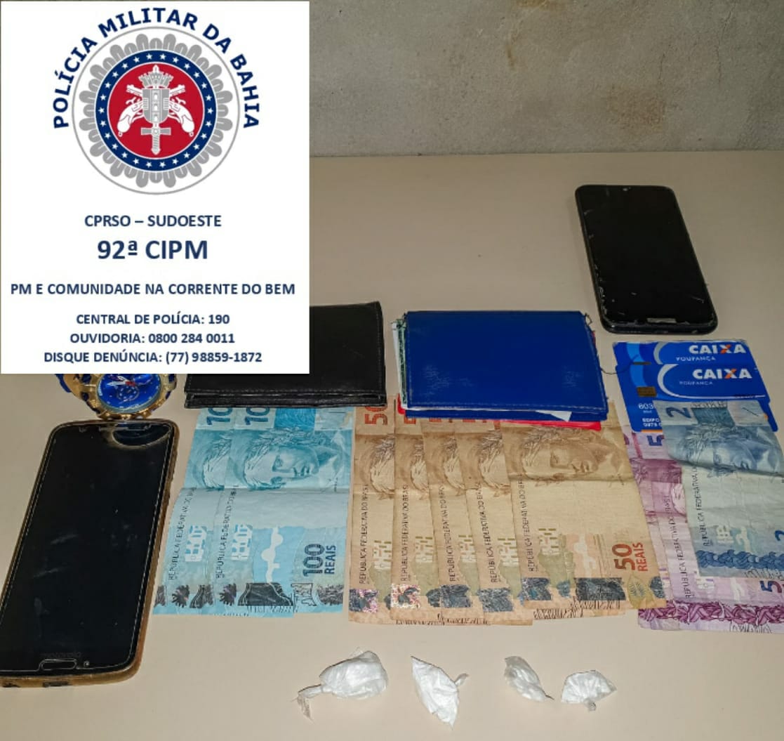 Durante rondas a 92ª Companhia de Policiamento Rural avistou em atitude suspeita uma motocicleta e um carro se retirando de local, na estrada do Iguá, próximo ao Aeroporto Glauber Rocha, em Conquista. A guarnição procedeu a abordagem do carro e da motocicleta, sendo encontrada no carro do motorista Euma quantidade de 3 embalagens de substância análoga a cocaína e 1 embalagem de substância análoga a cocaína foi encontrada com o motociclista Após consulta de ambos os veículos foi constatado o atraso do licenciamento da motocicleta, sendo a mesma apresentada no pátio do ciretran. Os suspeitos foram conduzidos ao Disep para adoção das medidas cabíveis pela autoridade competente.