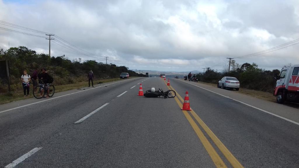Informo acidente tipo colisao frontal, no Km 28 do Anel Viario da BR 116, as 07h15 de hoje, envolvendo um veículo de passeio e uma motocicleta. Do acidente, restou vitimado o condutor da motocicleta, sexo masculino, com lesões graves, encaminhado ao Hospital de Base de Vitoria da Conquista. Causa: Ultrapassagem proibida realizada pelo condutor da motocicleta.