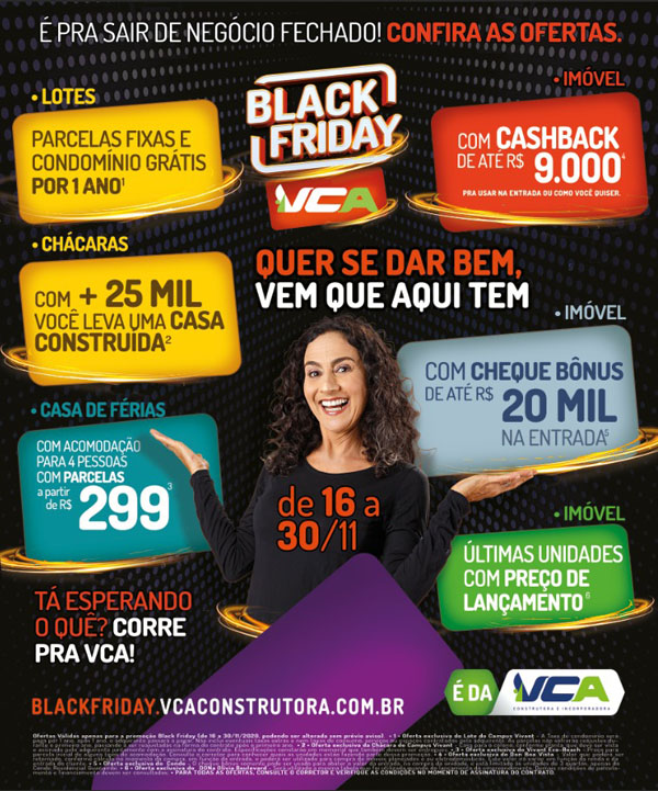 Chegou a maior Black Friday do mercado imobiliário!! Nesta semana, a VCA Construtora entrou no clima de grandes descontos e oferece aos clientes até o dia 30/11 condições imperdíveis para aquisição da casa própria.