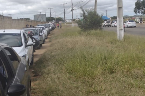 A fila de veículos é para a vacinação contra o coronavírus, que acontece durante todo o dia de hoje na sede do Comando de Policiamento Regional do Sudoeste.