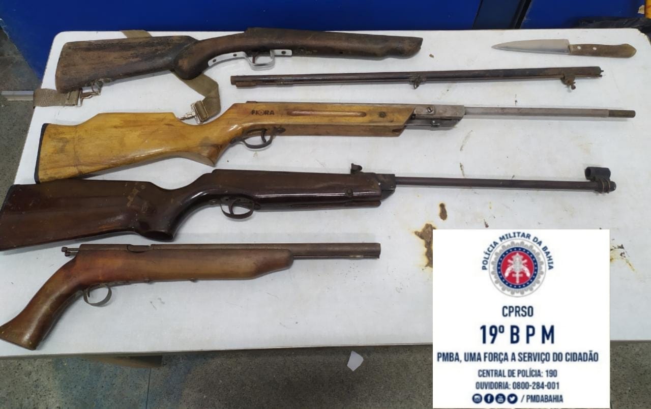 No local informado, os PMs acharam duas garruchas de fabricação artesanal, calibre 22, e duas armas de pressão, que foram encaminhadas, junto com o homem, para a sede da Delegacia Territorial (DT) de Jequié.