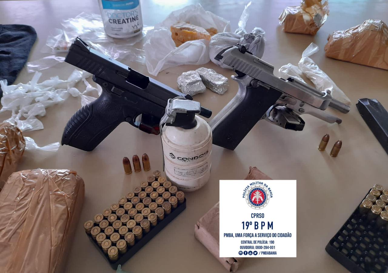 Duas pistolas calibre 9 milímetros – uma delas de fabricação turca – uma granada, quatro balaclavas, drogas e munições foram apreendidas por equipes do 19º Batalhão da Polícia Militar (BPM/Jequié), no final da manhã desta quinta-feira (5), no município de Jaguaquara, Sudoeste do estado. Quatro pessoas foram localizadas – uma delas com dois mandados de prisão em aberto por tráfico de drogas .