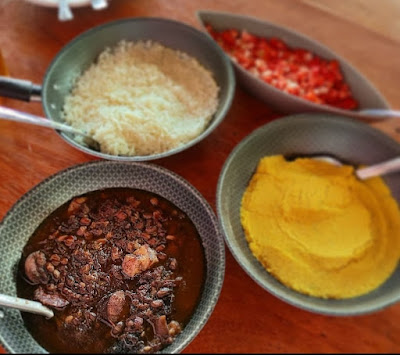 As comidas são feitas no fogão a lenha, porcionadas e congeladas, mas o arroz, a Farofa e a saladinha são feitas na hora. Vamos falar da feijuca, feita de um dia pro outro até os charques desfiarem, ainda leva toucinho, paio, e as iguarias de porco?! Deliciosa!