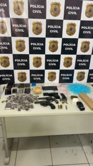 Em poder da quadrilha foram aprendidos 02 (dois) revólveres, 13 (treze) munições calibre .38, 04 (quatro) munições calibre .22, 01 (uma) munição calibre .762, geralmente utilizada em fuzil, 01 (um) simulacro de pistola, aproximadamente 700g de maconha, 133 (cento e trinta e três) buchas de maconha já embaladas para comercialização, aproximadamente 100g de cocaína, 05 (cinco) pinos de crack, 03 (três) balanças de precisão, centenas de cápsulas vazias e saquinhos também vazios, utilizados para embalar drogas, 01 (um) rádio comunicador, 08 (oito) aparelhos celulares e 01 (uma) motocicleta com sinais identificadores adulterados.