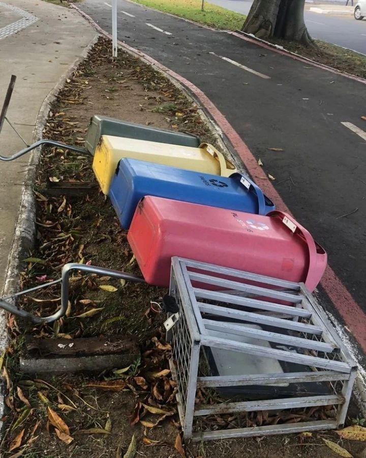 Vândalos destruíram plantas e lixeiras na movimentada via.