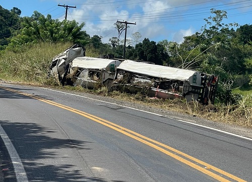 Uma carreta transportando combustível tombou na Curva do Engenho, BR-330, Ipiaú sentido Jitaúna. O acidente foi registrado por volta das 10h45 dessa terça-feira (03). O combustível, provavelmente óleo diesel e etanol, está escorrendo pela pista elevando um risco de explosão.