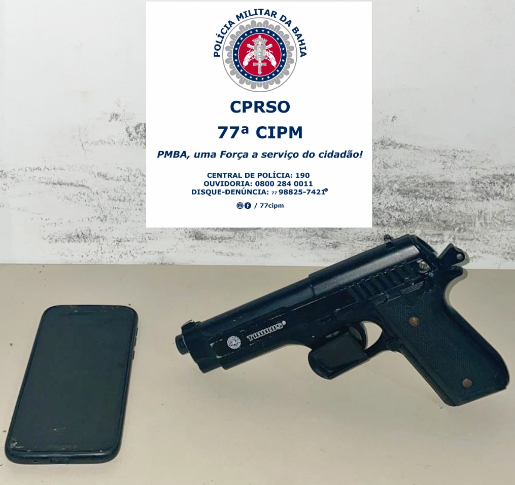Por volta de 16h40 desta terça-feira (17), durante patrulhamento tático no bairro Vila América, em Vitória da Conquista, uma guarnição do PETO da 77ª CIPM, foi acionada por populares, os quais haviam sofrido uma tentativa de roubo momentos antes, perpetrada por alguns indivíduos que portavam arma de fogo. De posse das informações a guarnição passou a diligenciar, vindo a localizar nas imediações, 03 indivíduos suspeitos, os quais, ao avistarem a viatura, correram. Um deles, menor de idade, foi contido e abordado, sendo encontrado em seu poder, um simulacro de arma de fogo. O menor admitiu que ele, juntamente com os outros dois menores que fugiram, tinham a intenção de roubar motocicletas para vender. Ele foi conduzido para o DISEP, juntamente com o material apreendido, para as devidas providências legais.