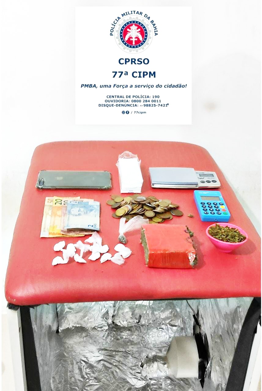 Por volta das 22h30 desta segunda-feira (23), durante o patrulhamento tático no centro de Vitória da Conquista, uma guarnição do PETO da 77ª CIPM, ao passar nas imediações da BR 116, percebeu que um indivíduo, ao visualizar a aproximação da viatura, tentou evadir-se. O referido foi contido e durante a abordagem, foram encontradas algumas substâncias aparentando tratar-se de cocaína. Ao ser indagado, ele admitiu que estava traficando e que em um imóvel localizado no bairro Ibirapuera, seu comparsa estaria guardando mais porções da mesma substância. Ao se dirigirem para o local indicado, já nas proximidades, os policiais avistaram um indivíduo saindo do referido imóvel. Durante a abordagem, o suspeito admitiu que também estava traficando e que possuía mais porções de droga, embalagens, balança de precisão e uma estufa artesanal, na qual cultivava maconha. Os indivíduos foram conduzidos, juntamente com o material ilícito, para o DISEP, onde a ocorrência foi registrada.