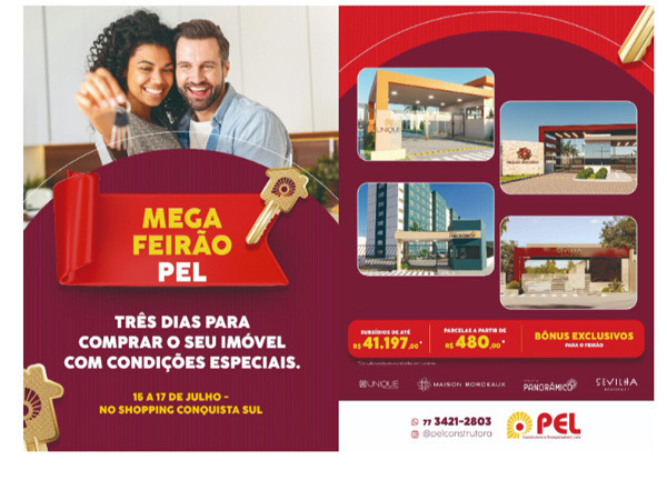 O momento de realizar o sonho da casa própria está batendo à sua porta. Nos dias 15, 16 e 17 de julho, no Shopping Conquista Sul, acontecerá o Mega Feirão PEL. Com condições especiais para todos os empreendimentos da construtora.