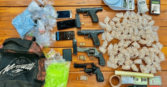 Num release divulgado, o 19º BPM informou que foram apreendidos 02 revólveres 38, 02 pistolas calibre 09mm, 03 aparelhos celulares, 1.080 pinos da crack, 1.000 pinos endorf vazioz, tesoura e embalagem para comercialização de drogas.
